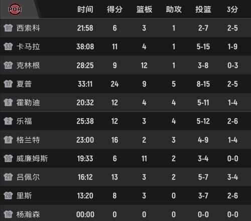 来看下本场数据:夏普24分9板5助攻,格兰特16分,霍勒迪12分4板4助,克林根9分12板,罗威6分11板,里斯8分3板。老鹰的麦科勒姆20分3板4助,奥孔武26分9板2助,约翰逊12分11板6助,沃克11分6板7助。杨瀚森昨日表现那么好,本场无缘出场,卡马拉15投5中,三分9中1,铁成这样,仅得11分,却能上场38分钟,斯普利特的用人遭到质疑。