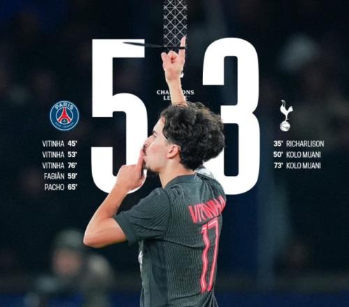 第59分钟,巴黎圣日耳曼反超比分!若昂-内维斯送出助攻,法比安-鲁伊斯在禁区中路推射破门。6分钟后,巴黎圣日耳曼又进球了!威廉-帕乔在门前抓住机会把球打进。第72分钟,穆阿尼突入禁区右侧,小角度抽射,球进了!热刺缩小差距。紧接着,罗梅罗手球送点。维蒂尼亚主罚,他稳稳罚进,完成帽子戏法。最后时刻卢卡斯-埃尔南德斯犯规被罚下。最终,巴黎圣日耳曼5-3击败热刺。