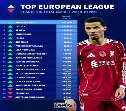 2025年欧洲联赛身价涨跌榜:英超上涨10.9亿欧居首,法甲第二